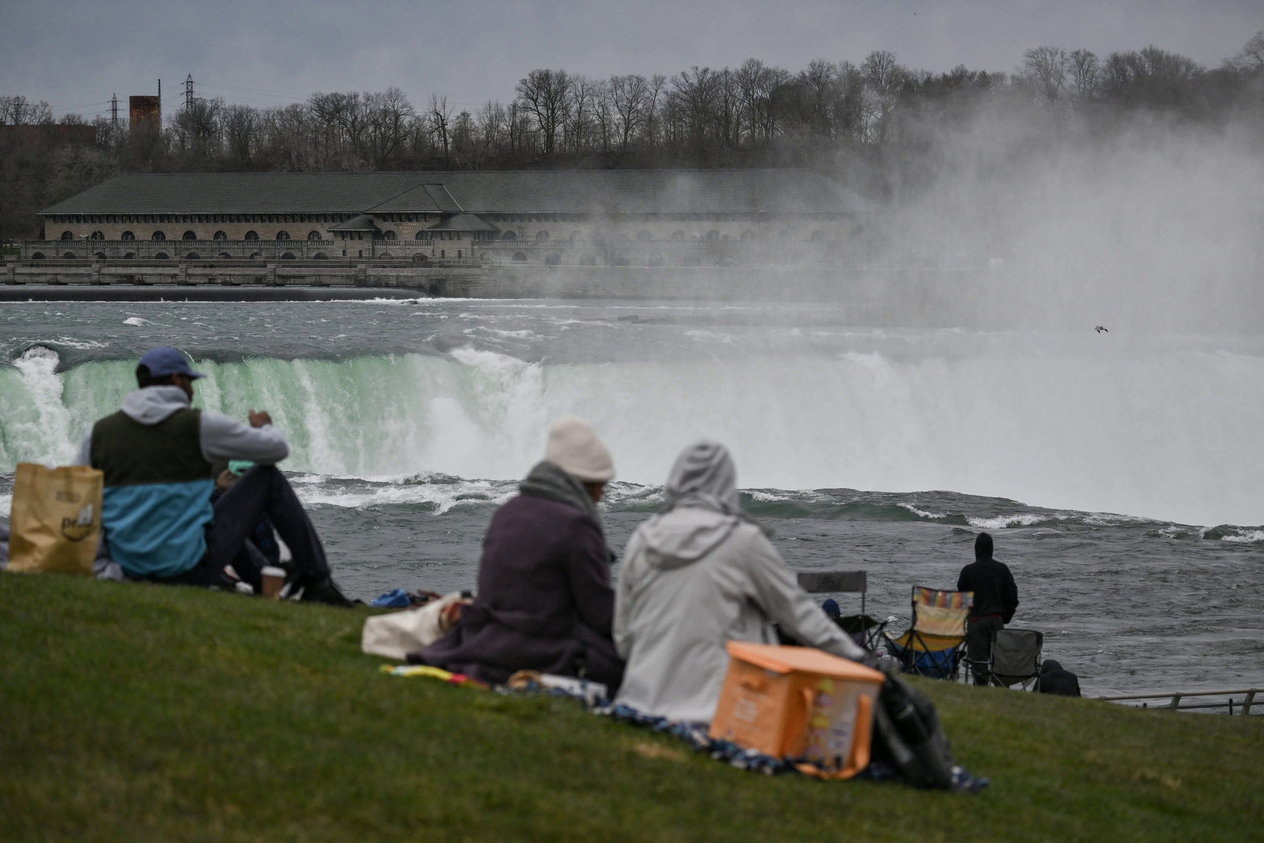 People are set up at Niagara Falls State Park ahead of a total solar eclipse across North America, in Niagara Falls, N.Y. (Angela Weiss/AFP via Getty Images)