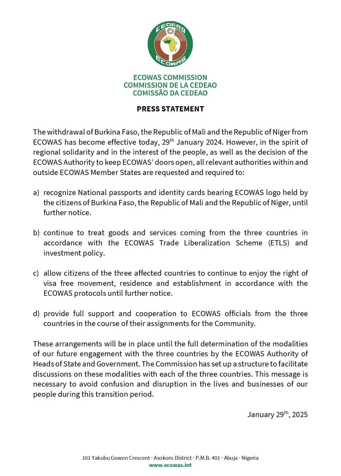 PRESS RELEASE: Withdrawal of Burkina Faso-Mali-Niger from ECOWAS.