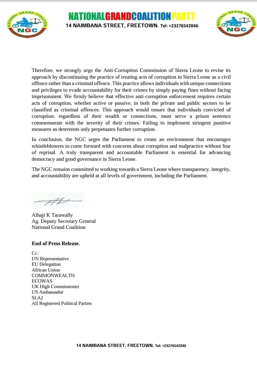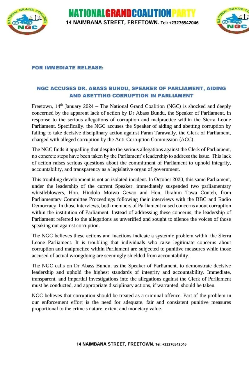 The NGC calls on Dr Abass Bundu, as the Speaker of Parliament, to demonstrate decisive leadership and uphold the highest standards of integrity and accountability. Immediate, transparent, and impartial investigations into the allegations against the Clerk of Parliament must be conducted, and appropriate disciplinary actions, if warranted, should be taken.